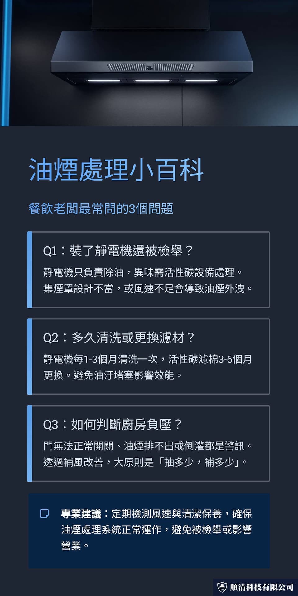 說明了油煙處理不是只買某設備就好,還關乎整體排風設計與設備保養。